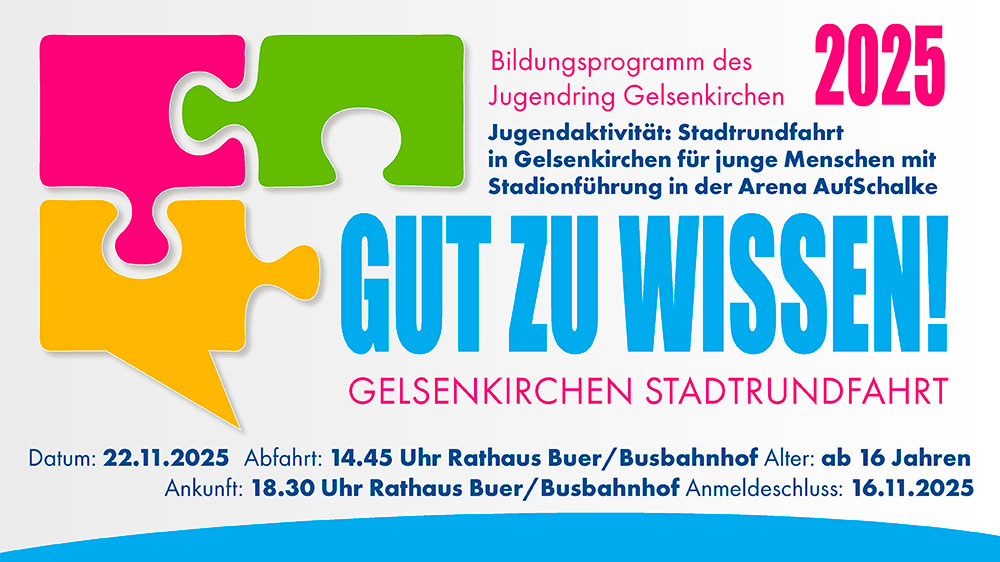 Jugendaktivität: Stadtrundfahrt in Gelsenkirchen für junge Menschen mit Stadionführung in der Arena AufSchalke • Datum: 22.11.2025 • Abfahrt: 14.45 Uhr • Rathaus Buer/Busbahnhof • Alter: ab 16 Jahren • Ankunft: 18.30 Uhr Rathaus Buer/Busbahnhof • Anmeldeschluss: 16.11.2025